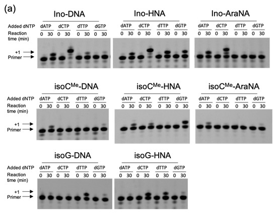 As shown in Figure 3, the fidelity of the primer extension was also different in each case. In this study, we evaluated the fidelity as the score of preference that indicated how much the most proffered dNTP was incorporated in the reaction. The score of the preference was calculated as the value of the highest efficiency (extended primer (%)) among the substrate dNTPs divided by the summed values of each efficiency (Table 1). According to this calculation, Ino-DNA, isoCMe-DNA, and isoG-DNA showed preferences of 52.4%, 75.9%, and 64.5%, respectively. It is important to mention that the efficiency magnitude trend was opposed to the preference, as the order of efficiency is Ino-DNA > isoG-DNA > isoCMe-DNA, whereas that of preference is isoCMe-DNA > isoG-DNA > Ino-DNA. This relationship might indicate that the efficiency could be dominant by the formation of hydrogen bonding as the fixation of the base orientation by hydrogen bonding should be advantageous for the polymerase reaction in the active site of the polymerase. However, such a hydrogen bonding formation possibility with other dNTPs provides the chance to incorporate with the active site, resulting in low fidelity. However, the fidelity could be dominant by the base-stacking interaction. As the base-stacking interaction shows the complementary relationship with hydrogen bonding [3], the incorporation of bases by stacking dominant manner would decrease the chance of the formation of hydrogen bonding with dNTP, which lowers the efficiency but increases the fidelity.