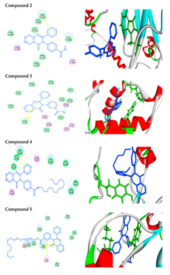 Binding modes/interactions of the synthetic compounds with active sites of AKT1 protein. (Left side) 2D representations demonstrating the molecular interactions between compounds and the active site region of AKT1 protein. The amino acid residues are shown in three-letter code, H-bonds are in pink doted lines, and π-interactions are in yellow lines. (Right side) 3D representations demonstrating the molecular interactions between compounds and the active site region of AKT1 protein. The compounds are represented by blue stick models, while the active site regions are shown by green stick models. H-bond contacts are shown in pink dotted lines, while -stacking is shown in yellow lines.