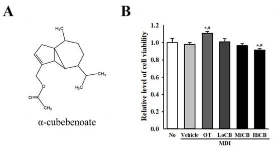 Cytotoxicity. (A) Chemical structure of α-cubebenoate. (B) Viability of 3T3-L1 adipocytes to α-cubebenoate. After incubation with 10, 20 and 30 µg/mL of α-cubebenoate for 24 h, the cell viability was determined by the MTT assay in duplicate. The data represents the means ± SD of duplicates. * indicates p < 0.05 compared to the No (untreated) group. # indicates p < 0.05 compared to the MDI+Vehicle treated group. OT; orlistat, MDI; adipogenic cocktail consisting of 3-isobutyl-1-methylxanthine, dexamethasone, and insulin, LoCB; low concentration (10 µg/mL) of α-cubebenoate, MiCB; middle concentration (20 µg/mL) of α-cubebenoate, HiCB; high concentration (30 µg/mL) of α-cubebenoate.