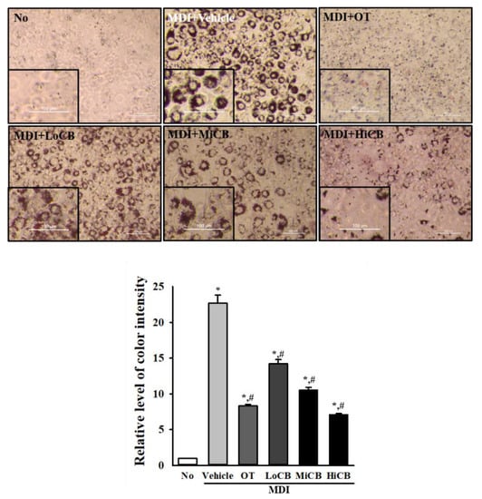 ORO staining analysis. 3T3-L1 pre-adipocytes were cultured in MDI medium with three different concentration of α-cubebenoate for 8 days, after which they were subjected to ORO staining analysis. The images of the ORO stained cells were observed with an inverted microscope at 100× magnification. The level of the stained lipid droplets was quantified by the Image J 1.52a program. The data represents the means ± SD of duplicates. * indicates p < 0.05 compared to the No (untreated) group. # indicates p < 0.05 compared to the MDI+Vehicle treated group. OT; orlistat, MDI; adipogenic cocktail consisting of 3-isobutyl-1-methylxanthine, dexamethasone, and insulin, LoCB; low concentration (10 µg/mL) of α-cubebenoate, MiCB; middle concentration (20 µg/mL) of α-cubebenoate, HiCB; high concentration (30 µg/mL) of α-cubebenoate.