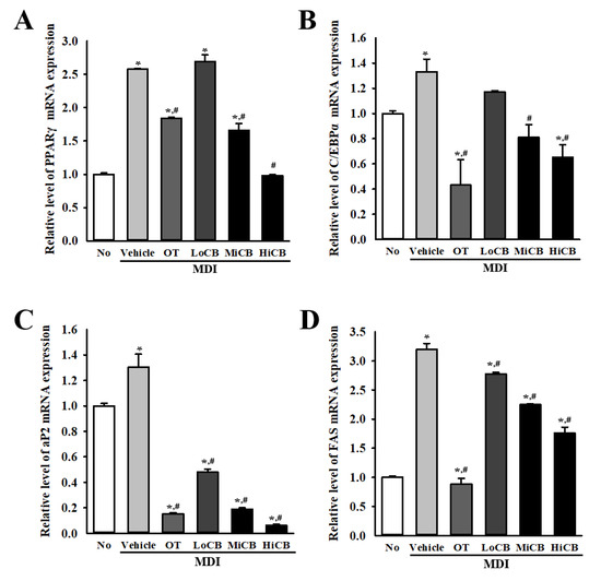 mRNA levels of adipogenic and lipogenic factors. After collection of total RNA from MDI-stimulated 3T3-L1 adipocytes treated with α-cubebenoate, the mRNA levels of two adipogenic transcription factors (PPARγ [A] and C/EBPα [B]) and two lipogenic proteins (aP2 [C] and FAS [D]) genes were measured by RT-qPCR as described in materials and methods. The data represents the means ± SD of duplicates. * indicates p < 0.05 compared to the No (untreated) group. # indicates p < 0.05 compared to the MDI+Vehicle treated group. OT; orlistat, MDI; adipogenic cocktail consisting of 3-isobutyl-1-methylxanthine, dexamethasone, and insulin, LoCB; low concentration (10 µg/mL) of α-cubebenoate, MiCB; middle concentration (20 µg/mL) of α-cubebenoate, HiCB; high concentration (30 µg/mL) of α-cubebenoate.