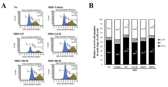 Cell cycle arrest analysis. (A) Cell cycle distribution. The cell cycle distribution of MDI-stimulated 3T3-L1 adipocytes treated with α-cubebenoate was analyzed with flow cytometric analysis of the DNA content of nuclei of cells after staining with propidium iodide (PI). (B) Analysis of cell number % of each cell cycle phase relative to total phases. The number of cells in the G0/G1, S, and G2/M stage were determined at each time point and each phase % is calculated as the percentage of the number of cells in the specific population relative to the number of total cells. The data represents the means ± SD of three replicates. * indicates p < 0.05 compared to the No (untreated) group. # indicates p < 0.05 compared to the MDI+Vehicle treated group. OT; orlistat, MDI; adipogenic cocktail consisting of 3-isobutyl-1-methylxanthine, dexamethasone, and insulin, LoCB; low concentration (10 µg/mL) of α-cubebenoate, MiCB; middle concentration (20 µg/mL) of α-cubebenoate, HiCB; high concentration (30 µg/mL) of α-cubebenoate.