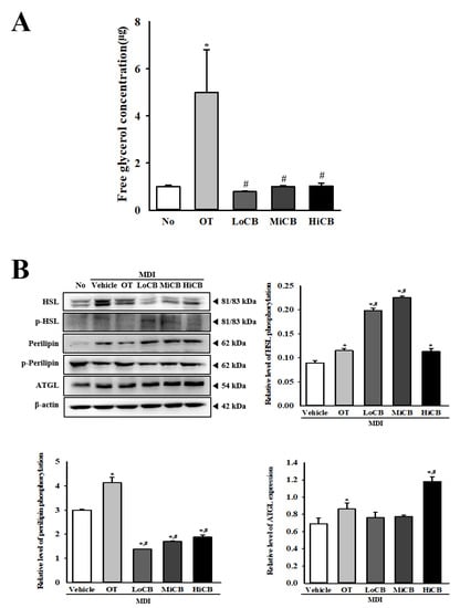Free glycerol release and lipolytic protein expression. (A) Level of free glycerol in culture media. Released glycerol was measured in the supernatant of primary adipocytes treated with three different concentrations of α-cubebenoate. (B) Expression level of lipolytic proteins. After the collection of total proteins from MDI-stimulated 3T3-L1 adipocytes treated with α-cubebenoate, the expression levels of HSL, p-HSL, perilipin, p-perilipin, ATGL and β-actin were detected with specific antibodies, followed by horseradish peroxidase-conjugated goat anti-rabbit IgG. Each band intensity was measured using an imaging densitometer, and the relative levels of each protein were calculated relative to the intensity of actin bands. The data represents the means ± SD of three replicates. * indicates p < 0.05 compared to the No (untreated) group. # indicates p < 0.05 compared to the MDI+Vehicle treated group. OT; orlistat, MDI; adipogenic cocktail consisting of 3-isobutyl-1-methylxanthine, dexamethasone, and insulin, LoCB; low concentration (10 µg/mL) of α-cubebenoate, MiCB; middle concentration (20 µg/mL) of α-cubebenoate, HiCB; high concentration (30 µg/mL) of α-cubebenoate.