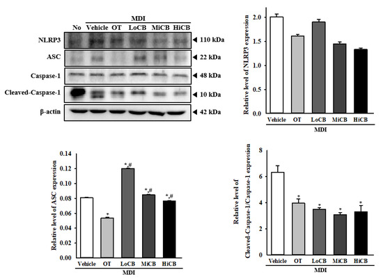 Expression of ASC, caspase-1 and NLRP3 protein. Western blot was performed to detect ASC, caspase-1 and NLRP3 proteins in the homogenates of MDI-stimulated 3T3-L1 adipocytes treated with α-cubebenoate using specific antibodies. After determining the intensity of each band using an imaging densitometer, the relative levels of ASC, caspase-1 and NLRP3 proteins were calculated based on the band intensity of β-actin protein as the endogenous control. The data represents the means ± SD of three replicates. * indicates p < 0.05 compared to the No (untreated) group. # indicates p < 0.05 compared to the MDI+Vehicle treated group. OT; orlistat, MDI; adipogenic cocktail consisting of 3-isobutyl-1-methylxanthine, dexamethasone, and insulin, LoCB; low concentration (10 µg/mL) of α-cubebenoate, MiCB; middle concentration (20 µg/mL) of α-cubebenoate, HiCB; high concentration (30 µg/mL) of α-cubebenoate.