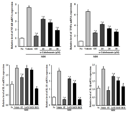 An inflammasome activation can trigger cleavage of caspase-1 and subsequent secretion of some inflammatory cytokines such as IL-1β and IL-18 []. To examine whether suppression of inflammasome activation is accompanied by an alteration in the expression of inflammasome-related cytokines, the expression level of several inflammatory cytokines was measured in the differentiated 3T3-L1 adipocytes after treatment with α-cubebenoate. The expression level of nuclear factor-kappa B (NF-κB), tumor necrosis factor (TNF) α, IL-6, IL-18, and IL-1β were remarkably higher in the MDI+Vehicle treated group compared to the No (untreated) group. However, these levels were significantly decreased in MDI-stimulated 3T3-L1 adipocytes treated with α-cubebenoate compared with the MDI+Vehicle treated group. Most of these reductions were α-cubebenoate concentration dependent (Figure 7). These results show that the suppression of inflammasome activation may be closely linked to the inhibition of inflammasome-related cytokine expression in MDI-stimulated 3T3-L1 adipocytes.