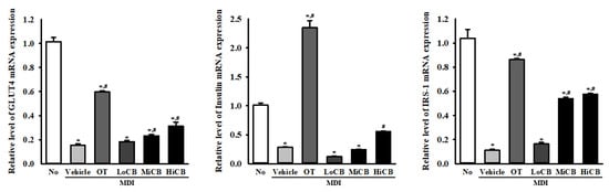 Transcription level of insulin receptor signaling molecules. After collection of total RNA from MDI-stimulated 3T3-L1 adipocytes treated with α-cubebenoate, the mRNA levels of GLUT4, insulin and IRS-1 genes were measured by RT-qPCR as described in materials and methods. The data represents the means ± SD of duplicates. * indicates p < 0.05 compared to the No (untreated) group. # indicates p < 0.05 compared to the MDI+Vehicle treated group. OT; orlistat, MDI; adipogenic cocktail consisting of 3-isobutyl-1-methylxanthine, dexamethasone, and insulin, LoCB; low concentration (10 µg/mL) of α-cubebenoate, MiCB; middle concentration (20 µg/mL) of α-cubebenoate, HiCB; high concentration (30 µg/mL) of α-cubebenoate.