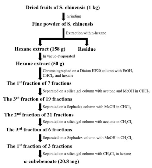 To isolate α-cubebenoate, the dried fruits of S. chinensis (1.0 kg) were ground to a fine powder. The active ingredient was extracted successively with n-hexane (3 L) at room temperature. The hexane extract (158 g) was in vacuo evaporated and 50 g was chromatographed on a Diaion HP20 (250–850 μm; Sigma-Aldrich, St. Louis, MO, USA) column (40 × 8 cm2) using EtOH, chloroform, and hexane to obtain 7 fractions. The first fraction (17SCH1, 22.95 g) was separated on a silica gel column (80 × 6.5 cm2) sequentially with 0.5% acetone, 25% acetone, and 25% MeOH in CHCl3 to obtain 19 fractions. The 3rd fraction (17SCH1IC, 430.2 mg) was separated on a Sephadex column (100 × 3.0 cm2) using 50% MeOH in CHCl3 to obtain 21 fractions, and the 2nd fraction (17SCH1ICIB, 161.9 mg) was separated on a silica gel column (60 × 2.0 cm2) using 5% acetone in CH2Cl2 to obtain 6 fractions. The 3rd fraction (17SCH1ICIBIC, 130.4 mg) was then separated on a Sephadex column (100 × 3.0 cm2) using 50% MeOH in CH2Cl2 to obtain 3 fractions. Finally, the first fraction (17SCH1ICIBICIA, 101.9 mg) was separated on a silica gel column (73 × 3.0 cm2) using 50% CH2Cl2 in hexane to yield α-cubebenoate (17SCH1ICIAIL, 20.8 mg) (Figure 9).