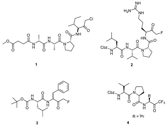 Representative examples of a peptidyl chloromethyl ketone (1) [], peptidyl fluoromethyl ketones (2 [] and 3 []), and a peptidyl tri-fluoromethyl ketone (4) [].