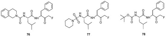 The onset and progression of certain neurological diseases such as Alzheimer’s, stroke, and epilepsy has been associated with the presence of activated calpain I in the body []. During a stroke, the intracellular Ca2+ concentration increases as a result of various biochemical events. This subsequently leads to the activation of calpain I which is responsible for degradation of neuronal structural proteins. For this reason, the development of calpain I inhibitors is desirable in order to prevent neurodegeneration, thus combatting neurological disorders. A selection of peptidyl FMK dipeptides with varying amine protecting groups were synthesised and found to be potent irreversible inhibitors of calpain I. Interestingly, changing the N-capping group could be used to enhance the selectivity of the compound in favour of inhibiting calpain I over cathepsin B and L, along with altering potency. The absence of a protecting group was found to give poor inhibition, whilst t-Boc appeared to give the best selectivity for calpain I over cathepsin B. Additionally, a hydrophobic group was preferred at the P1 position in order for potent inhibition to occur. The importance of Leu or Val at P2 was also notable from the results reported. The most potent compound tested (k = 276,000 M−1 s−1) (76) along with the FMKs showing the greatest calpain I selectivity (77 and 78) can be seen in Figure 3. In addition to exhibiting good activity in an assay, these compounds were found to be cell permeable and capable of inhibiting intracellular recombinant human calpain I.