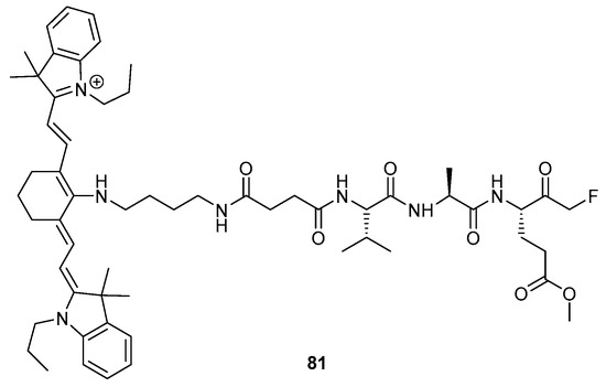 In addition to their applications in the field of drug discovery, peptidyl FMKs have also been widely employed as chemical tools for the interrogation of biological systems []; for example, the elucidation of the structure and binding requirements for protease receptors in order to design drugs with greater selectivity and potency. Useful information can also be gained in relation to the active site selectivity of individual proteases within broader protease classes. This can be achieved through observing the nature of the binding interactions when amino acid groups in the peptide region of the peptidyl-FMK chain are varied until the binding requirements are fully satisfied []. Conjugation of dyes into the FMK structure, an example of which is shown in Figure 5 (81), has also been explored in order to allow for fluorescent imaging of cellular activity such as apoptosis [].