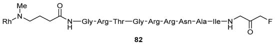 Ellis and coworkers describe another example in which peptidyl FMKs are useful for understanding the structural binding requirements and properties of a target enzyme []. In this case, inhibitor 82 (Figure 6) was synthesised and found to be a potent and selective irreversible inhibitor of PKACα, a kinase enzyme. The structure of the inhibitor consists of an electrophilic fluoromethyl ketone moiety attached to a substrate-competitive inhibitor scaffold. This means that if the FMK binds in a region in which a reactive cysteine residue is present, the nucleophilic cysteine will attack the electrophilic FMK, causing inhibition. The nature of the peptide scaffold also plays a key role as it allows the peptide to bind in the vicinity of the reactive cysteine, an essential requirement for successful inhibition. As a result, inhibitor 82 is capable of covalently binding to and modifying a cysteine residue at the binding site of the enzyme. The incorporation of rhodamine B, a fluorescent tag, was employed in order to allow the inhibitor-substrate adduct to be observed, thus helping to confirm that the mechanism of inhibition occurs in an irreversible manner. In this way, the peptidyl FMK developed was found to be a useful tool for studying PKACα activity.