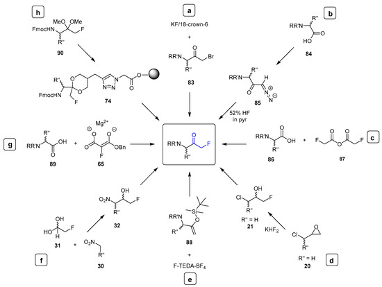 Given their applications in these aforementioned areas, a range of synthetic approaches have been developed to access FMKs. The key synthetic solid- and solution-phase routes discussed in this review for accessing peptidyl mono-fluoromethyl ketones (FMKs) are summarised in Figure 7. These include halogen exchange methods (Figure 7a [,], diazomethyl ketone fluorination (Figure 7b) [], a modified Dakin–West reaction (Figure 7c) [], epoxide ring opening with a fluoride source (Figure 7d) [,], fluorination of silyl enol ethers (Figure 7e) [], utilisation of a fluorinated hemiacetal/aldehyde (Figure 7f) [,,,], and the use of magnesium fluoromalonates (Figure 7g) [,,,,]. Additionally, the use of a linker has been employed where appropriate for the synthesis of peptidyl FMKs by solid-phase peptide synthesis (Figure 7h) []. With many of these approaches suffering from low overall yields, racemisation, and incompatibility with solid phase peptide synthesis (SPPS) methodology, there is clearly still scope for the future development of new synthetic routes in this area.