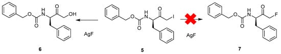 An early attempted solution-phase peptidyl mono-FMK synthesis looked to use the displacement of bromide or chloride with a source of inorganic fluoride in a halogen-exchange reaction. However, this approach did not produce the desired FMK (7), but rather, resulted in a nonfluorinated compound (6) along with various unwanted side-products (Scheme 1) [].