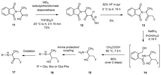 Formation of peptidyl mono-FMK building block (17) via a diazo intermediate [].