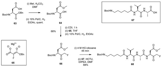 Van der Marel et al. [] described an approach that made use of monobenzyl fluoromalonate magnesium enolate 65 as opposed to the neutral magnesium salt (56). The procedure for accessing FMK 68 (Scheme 12) involves an adapted version of the patented methodology described by Palmer et al. []. Initial side-chain esterification and subsequent debenzylation of 63 allowed isolation of acid 64. Further reaction with CDI followed by addition of enolate 65 and subsequent hydrogenation gave FMK 66 in a yield of 68%. This was then Boc-deprotected under acidic conditions and coupled to fragment 67 in order to generate the FMK (68). In this case, the Boc group in 68 was removed and reacted with BODIPY TMR-OSu, which allowed for the preparation of a fluorescent probe for studying yeast peptide N-glycanase activity.