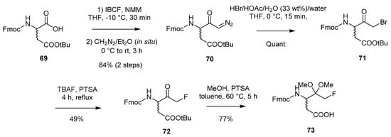 At present, only one solid-phase peptide synthesis (SPPS) method for accessing peptidyl mono-FMKs has been reported in the literature []. The approach involves initial formation of the FMK moiety through utilisation of a halogen-exchange reaction in a similar manner to the work of Kolb et al. [] described earlier (Scheme 2). This is followed by attachment to the resin and peptide elongation. The first part of the process, involving construction of the FMK group from the amino acid building block Fmoc-Asp(OtBu)-OH (69), is shown in Scheme 13. Firstly, the formation of diazoketone derivative 70 is achieved via a two-step process involving diazomethane. 70 is converted to the bromomethyl ketone 71 with HBr and then subsequently transformed into the desired FMK (72) using TBAF as a fluoride source in the presence of p-toluenesulfonic acid (PTSA). Repeating these steps using Fmoc-Gly-OH to produce the corresponding FMK analogue resulted in purification difficulties. As a result, the diazoketone was instead converted to the FMK via the hydroxymethyl ketone instead of the bromomethyl ketone, as this proved more successful for this particular substrate (not shown in scheme).