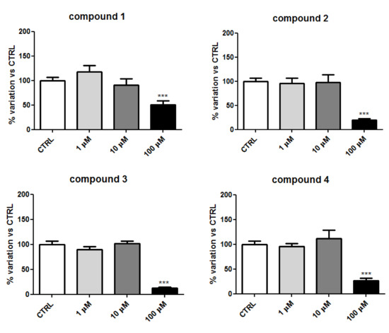 Cellular proliferation was tested using a colorimetric assay of 3-[4,5-dimethylthiazol-2-yl]-2,5-diphenyltetrazolium bromide (MTT). We seeded 2000 cells/well in a final volume of 200 μL growth medium in 96-well plates. After 24 h the cells were stimulated with or w/o the newly synthesized compounds for 24 h, or, where indicated, for 48 h. We tested seven new synthesized compounds together with RSV reference at different concentration (1, 10, 100 μM). All compounds were dissolved in DMSO and the experimental dilutions used were made using cellular growth medium. For this reason, the cells were also incubated for 24 h with the DMSO at the same concentration used for the compounds. Incubation was terminated by adding 20 μL of MTT solution (5 mg mL−1 in phosphate-buffered saline (PBS)) to each well, followed by incubation at 37 °C for 3 h in the dark. After, the plates were centrifuged at 2000 rpm for 15 min. The supernatant was removed, 200 μL dimethylsulfoxide (DMSO) was added to each well, and the plates were incubated for 30 min at 37 °C in the dark. Finally, the plates were read at 540 nm on a scanning multi-well spectrophotometer (Cary50MPR, Varian, Santa Clara, CA, USA) [53].