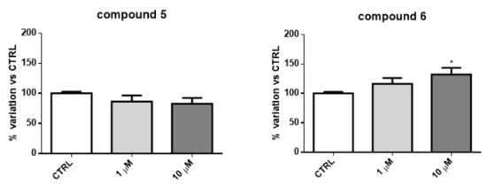 Dose-response effects of compounds 5, 6 and RSV in C2C12 cells after 48 h. MTT reduction assay in C2C12 cells in the presence of compounds 5, 6 and RSV. The cells were incubated for 48 h at different concentration of the compounds (1, 10 µM). After this period, cell viability was quantified by measuring MTT reduction. CTRL: control, cells w/o compounds. RSV: resveratrol. Data are expressed as % variation vs. CTRL. The means ± SEM derived from 3 different experiments (each with n = 8) and were analysed using unpaired t-tests, * p = 0.0345.