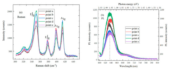 It can be found, by observing Figure 5a, that there are two characteristic peaks in the Raman spectrum of the WS2 sample, and the peak positions of the E12g and A1g characteristic peaks are respectively located at 349 cm−1 and 413 cm−1, which are fitted by the Gaussian function. The peak shift between two characteristic peaks decreases with the layer number decreases, which can be explained by the increase of the Van der Waals force. The Raman spectrums on the triangular WS2 sample remain consistent at different points, which can indicate that the sample is uniform. In Figure 5b, the strongest PL spectrum peak position of monolayer WS2 is located at 636 nm. The band gap of monolayer WS2 is calculated at 1.96 eV from the conversion relationship between the wavelength and electron volt, which is the same as the reported results. Besides, the PL spectrum also has an exciton peak of 2.04 eV. This is because the WS2 sample has energy band splitting [23]. Figure 5c shows the Raman spectrum of monolayer WS2 under the different laser powers. The Raman spectrum shape and relative position of the WS2 sample move, to a certain extent, when the laser power increases. The Raman intensity of the E12g characteristic peak increases with laser power increase, and the E12g characteristic peak shape changes, especially when the laser power exceeds 10%. Meanwhile, the A1g characteristic peak intensity remains constant, but the position has a certain deviation. The PL spectrum intensity of the WS2 sample strongest peak increases with a laser power increase, the strongest peak position is red-shifted, and the shape changes to some extent, as shown in Figure 5d. This phenomenon can be explained from two aspects here; on the one hand, higher power would generate more heat on the WS2 sample, which has an effect on the power PL spectrum of WS2; on the other hand, the SiO2/Si substrate selected in the WS2 growth experiment is an n-type doped semiconductor material [24].