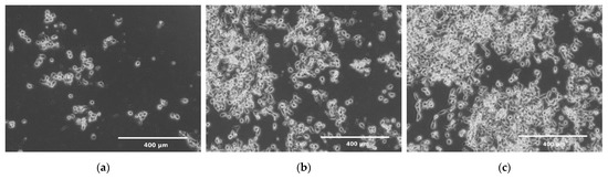 A 1 × 106 cell suspension was prepared in 100 μL culture medium (per chamber). Figure 2b shows the process of seeding cells into the culture chambers of the chip. 30 μL of the cell suspension was added to inlets of two reservoirs (3) (control culture and the test culture) by a pipette. The indicator chamber (2) was filled with a complete medium. Then, the microchip was inclined to the constant angle of 10° to direct fluids from reservoirs to chambers. Thanks to this, during the slow flow of the cell suspension in the culture chamber, the cell sedimentation takes place, and they evenly cover the bottom surface of the chamber. The cell seeding process was repeated three times. The excess of fluids was removed from the outlet reservoirs each time. The distribution of cells in CC are presented in Figure 3a–c. Cells tend to agglomerate, which is a microdevice design-independent parameter and mainly depends on procedure of preparation of the suspension of cells prior to seeding. To reflect the device/procedure-dependent distribution parameter, we have also used melamine resins (cat. no. 90,637, Merck, Darmstadt, Germany) of 2 µm diameter as an indicator in seeding tests to investigate the uniformity of the CC surface coverage. The mean surface concentration of particles in the working area of culture chambers reached 6200 particles/mm2 with a standard deviation of 4.26% along a channel (Figure 3d,f). The value of SD was calculated from the analysis of microscopic photos taken along the chip’s CC with the interspace of 5 mm (10 × 3 = 30 pictures).