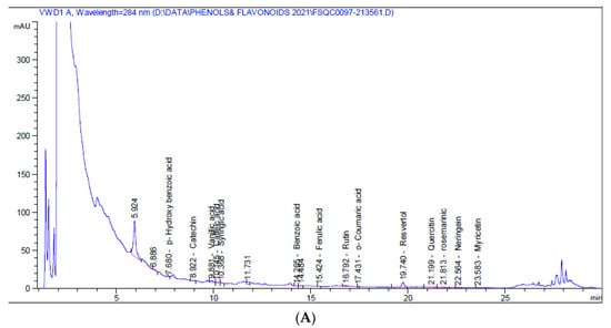 HPLC was used to analyze flavonoids and phenolic compounds in both aqueous and alcoholic extracts, as previously described [42]. The HPLC (Agilent1260 infinity HPLC Series, Agilent Technologies, Santa Clara, CA, USA) was equipped with a Quaternary pump and Kinetex 5 μm EVO C18 (100 mm × 4.6 mm) column (Phenomenex, Torrance, CA, USA) operated at 30 °C. The separation was achieved using a ternary linear elution gradient with HPLC grade water 0.2% H3P04 (v/v), methanol, and acetonitrile. The injected volume was 20 μL and the VWD detector was set at 284 nm.