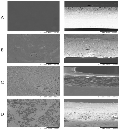 The films were previously cut into small squares of 5 × 5 mm and fixed on a metallic cylindrical support. Film surfaces and film cross-sections were analyzed by scanning electron microscopy (FEI Company, Quanta 200 MK2, Fremont, CA, USA) at a magnification of x600 (surfaces) and x800 (cross-sections).