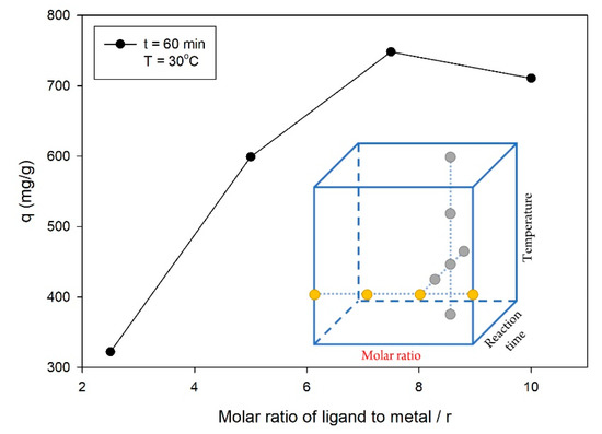 Effect of the molar ratio of ligand to the metal on the value, with the following experimental conditions: reaction time = 60 min and temperature = 30 °C.