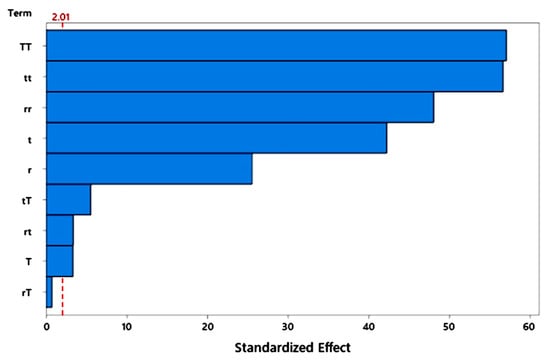 Pareto chart of the standardized effects of the independent parameters on the synthesis of ZIF-L, as measured by the response.