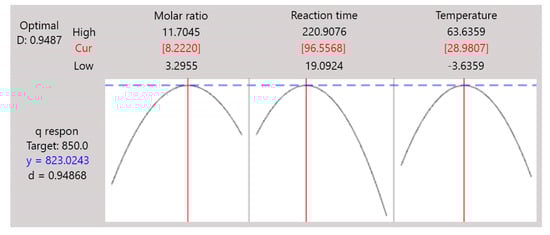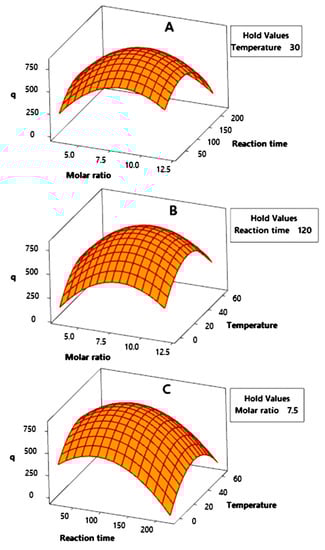 Figure 5A describes the interaction between the molar ratio and the reaction time, with the temperature as the hold parameter. The highest point of the value was obtained around a molar ratio of 8 and a reaction time of 100 min. This interpretation is continued in Figure 5B, which describes the interaction between the molar ratio and the temperature, with the reaction time as the hold parameter. This surface plot peak was obtained around a temperature of 30 °C and the same molar ratio as in Figure 5A. The interpretation of these 3D surface plots is confirmed by Figure 5C, in which the peak was obtained in the interaction between the same values of the reaction time and temperature. Furthermore, an optimization study was carried out to determine the real values of these three independent parameters in order to obtain the optimum value.