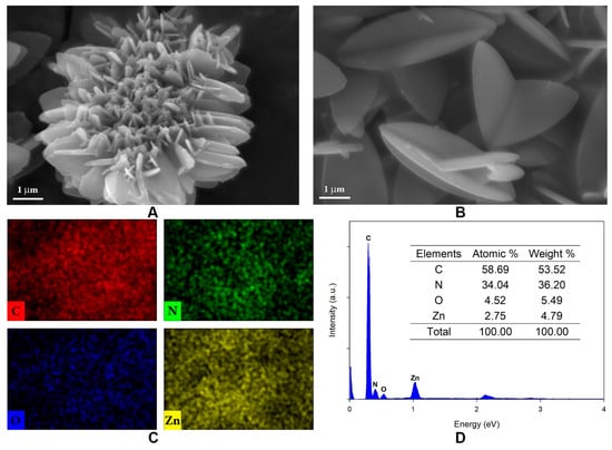 SEM photography of the ZIF-L synthesized (A) without the sonication step and (B) with the sonication step, along with (C) EDX mapping and (D) EDX analysis.