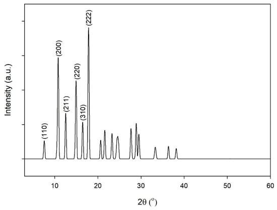 The crystallinity of the ZIF-L was characterized using XRD analysis. As shown in Figure 8, the diffraction peaks of ZIF-L at the (110), (200), (211), (220), (310) and (222) planes were observed at 2θ values of 7.58°, 10.80°, 12.54°, 14.95°, 16.49° and 17.86°, respectively. This result had an excellent agreement with several reports from previous studies [,,,,]. This proves that ZIF-L was successfully synthesized to have a high crystallinity.