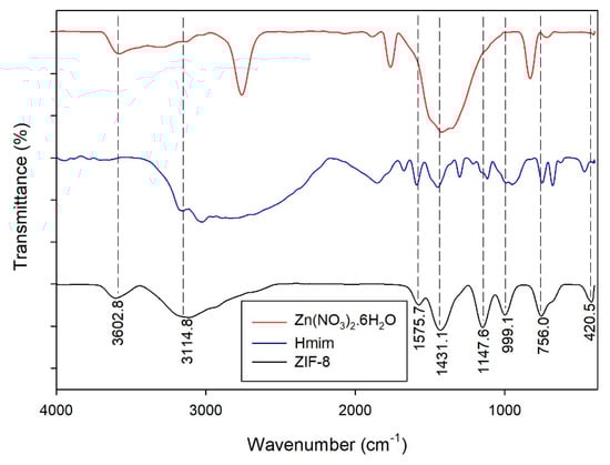 The functional groups of the ZIF-L were characterized using FTIR analysis. Figure 9 shows the FTIR spectra of the zinc precursor, ligand and ZIF-L. The spectrum of ZIF-L was similar to the spectra of the zinc precursor and ligand, meaning that the functional groups of ZIF-L were constructed from the functional groups of the zinc precursor and ligand. In the fingerprint region, several transmittance peaks were observed to identify the functional groups of the ZIF-L. The peaks observed at 420.5, 756.0 and 900–1350 cm−1 are associated with the Zn-N stretching of ZIF-L, the out-of-plane bending of the Hmim ring, and the in-plane bending of the Hmim ring, respectively [,,,,].