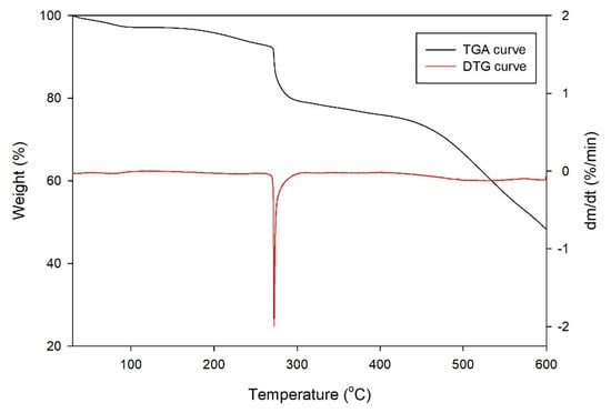 A TGA analysis was carried out for ZIF-L under a nitrogen flow, and the results are presented as the TGA and DTG curves in Figure 10. These results were compared with several previous studies, and they show a similar pattern of weight loss [,]. As shown in the TGA curve, the first weight loss gradually occurred at temperatures below 275 °C. This weight loss might be caused by the removal of moisture content and residual ligand from the ZIF-L surface. The removal of residual ligand was also indicated by the highest rate of weight loss at 272 °C, as shown by the DTG curve. Next, the good thermal stability of ZIF-L was observed at temperatures between 275 and 475 °C, where a long plateau was seen in the TGA curve. At temperatures above 475 °C, the ZIF-L structure began to collapse, as indicated by significant weight loss. However, this weight loss rate was minimal, as shown in the DTG curve, such that the collapse of the ZIF-L structure occurred gradually and took a long time in reasonably high temperatures.