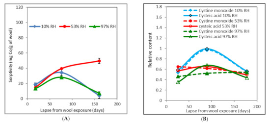 The initial sorptivity values for wool with marginal RH are lower (10% RH ~13 mg Co(II)/g wool; 97% RH ~10.5, resp.) than those for non-irradiated wool, while wool with 53% RH showed sorptivity ~30.8 mg Co(II)/g, which is more than that for the corresponding non-irradiated sample (Figure 2A). The sorptivity of 10% RH and 53% RH samples follows the 2nd degree multinominal trend, and the curves grow monotonically with time. The sample with the highest moisture shows an extreme at the lapse of 76 days with the sorptivity of ~77 mg Co(II)/g, but after 160 days it drops to ~60 mg Co(II)/g, which is less than that of samples with lower humidity (10% RH ~72 mg Co(II)/g wool; 53% RH ~74, resp.).