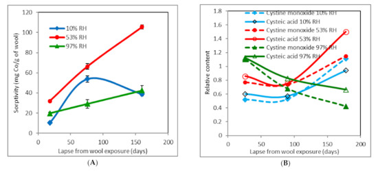 The character of cysteic acid and cystine monoxide development for the sample with 53% RH (Figure 2B) indicates first a slight increase in the acid at the expense of the monoxide content, which decreases throughout the time interval. From this, it can be concluded that the oxide transformation into acid is a reversible process and the typical conditions under which it takes place decide the result. This corresponds to the relevant time variation of the curve for the oxide to acid ratio (Figure 2C); this course is first declining, i.e., the monoxide is transformed into acid, which is associated with the growth of sorptivity (Figure 2A) related to the amount of cystine acid as a prerequisite for Co salt formation. In the second time segment, the monoxide content rises only slightly (Figure 2C) and the sorptivity increase is more moderate (Figure 2A). In the sample conditioned at 97% RH, the initial content of the oxide and acid is lower than that for both the previous samples (Figure 2B). The oxide amount increases slightly throughout the time interval, but the acid content shows extreme similarity to the wool conditioned at 10% RH. An analogous course can also be observed for the corresponding sorptivity. We assume that it is the high humidity impact, changing individual structural forms affecting sorptivity. From Figure 2C, it is clear that the minimum on the curve corresponds to the sorptivity maximum (Figure 2A). The final predominance of the oxide over the acid is the highest compared to the other two samples, although the sorptivity is comparable to the wool conditioned at 10% RH. We attribute these anomalies to the high initial humidity. We assume that it affects the kinetics or mechanism of transformation of the monoxide into acid, and vice versa. However, other yet unreported effects cannot be excluded since despite the differences in dependencies in Figure 2B,C, the course of the corresponding sorptivity (Figure 2A) is similar to that of the 10% RH wool. From the measurements carried out for the non-irradiated wool, it can be seen that despite the experimentally unconfirmed and only a hypothetical expectation of no reasons for change, time-dependent physico-chemical processes have already run in naturally conditioned wool. The precipitous deviation of wool moisture from an equilibrium value disrupts the original hydrogen bonds, which must also effect conformational changes in the secondary structure (α-helical, β-sheet, mixed, amorphous structure). Given that there is dual moisture in wool, bound physically and chemically, the process of uptake/release of water runs at a different rate [33]. In the case of dehydrated wool, recovery of the initial inter- and intramolecular bonds between water and keratin within the following, keeping in conventional laboratory conditions, requires some time. If the environmental moisture is higher than balanced, H bonds will be added to the original ones due to hydration of other functional groups or permeation of water into hollow channels inside the fibers. This can block spots with adsorption or coordinating potential. In both (or in all) cases, the wool samples with a different equilibrium moisture will gradually tend to the thermodynamically most preferred condition in order to achieve equilibrium humidity. Continuous changes in the conformation of the secondary structure also affect the spatial availability of the acids, and suitable ligands are needed to generate complex cobalt salts with wool. This is confirmed by the time course of sorptivity (Figure 2A). The study by Hanzlíková et al. [29] showed that, in both non-irradiated and irradiated wool, the proportion of the individual conformational forms in the secondary keratin structure varied with time and did not show any soundness. Those measurements were performed in a non-conditioned environment where RH fluctuation in the laboratory was spontaneous according to the outer environment. Therefore, we can consider that the composition of conformational forms and the related sorptivity are sensitive to RH environment variations. By the way, it is known that wool is an excellent moisture regulator; dry wool absorbs high humidity from the surroundings, whereas wet wool releases water into a dry environment. So the wool humidity oscillates to achieve some equilibrium status under the given circumstances.