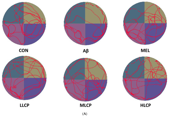 Figure 3A shows the average swimming path during the 90 s of each group recorded by the video tracking system. Except for the Aβ group, the other groups swam faster to arrive at the platform zone (p < 0.05). The time spent and crossing frequency in the platform zone are shown in Figure 3B,C. It was found that the time spent and crossing frequency in the target zone of the Aβ group were 13.57 ± 8.09 s and 3.50 ± 2.97, respectively. These values were lower than that of MEL, LLCP, MLCP, and HLCP groups (25.39 ± 8.32, 26.16 ± 10.65, 26.15 ± 4.64 and 28.90 ± 12.20 s and 6.87 ± 1.88, 7.87 ± 1.55, 7.37 ± 1.68 and 7.00 ± 2.13 times, respectively (p < 0.05).