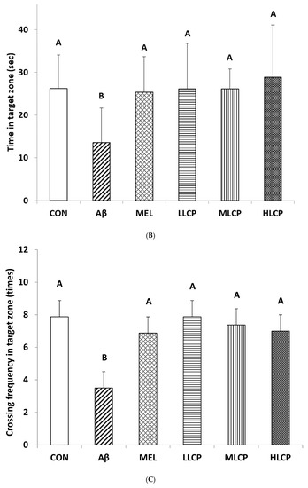 The effects of LCP on the escape distance of the water maze test for each group from the first day to the third day are shown in Table 2. In the water maze memory test, the value for finding the platform was lower, and the swimming distance value was shorter. On the first day, the total swimming distance to find the platform of each group had no significant difference from 9.39 to 10.74 m. On the second day, mice were familiar with the platform’s location and reduced the swimming distance from 5.31 to 8.67 m, which was significantly lower than that of the Aβ group (10.71 m). The swimming distance for the Aβ group on the third day was 8.24 m, which was considerably higher than that of the CON, MEL, LLCP, MLCP, and HLCP groups from 3.00 to 5.07 m (p < 0.05).