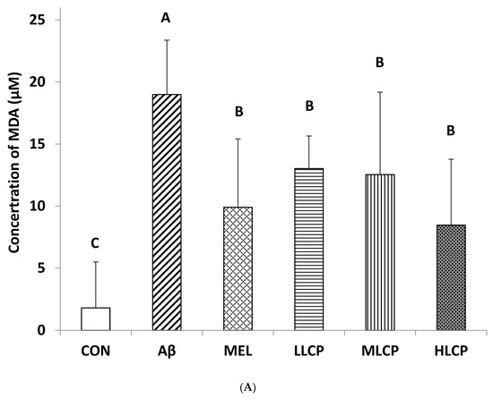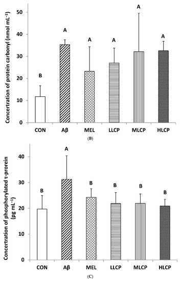The concentration of protein carbonyl in the Aβ group (35.34 ± 2.20 nmol/mL) was significantly higher than that in the CON group (11.74 ± 4.94 nmol/mL) in Figure 4B (p < 0.05). However, compared with these five Aβ-injected treatment groups, protein carbonyl contents in the MEL and LCP groups ranged from 23.22 to 32.58 nmol/mL and had no significant differences compared with the Aβ group (p < 0.05).