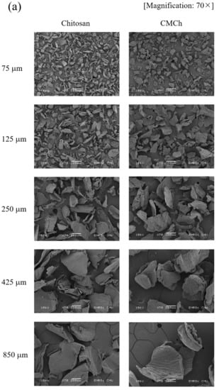 The morphology of chitosan and CMCh chitosan powders with different particle sizes was analyzed using the stereo microscope and SEM. As shown in Figure 2, chitosan powders are relatively opaque, and have a slightly rough surface and irregular shape particles. Conversely, CMCh powders are relatively transparent due to the reduction in crystallinity after chemical modification, which is in agreement with our previous study by XRD result [12]. In addition, CMCh powders have rougher surfaces compared to chitosan. Likewise, SEM images (Figure 3a,b) showed that the surface morphology of CMCh powders was rougher than that of chitosan powers. This was due to the damage on chitosan surfaces and the weakening of chitosan structures, which caused the reduction in chitosan crystallinity [28,29]. This allowed the carboxymethylization, and resulted in the formation of the bulky groups (–CH2COOH) on chitosan surfaces, which is consistent with the studies of Mohamed et al. [30] and Sabaa et al. [31]. The average particle sizes of chitosan and CMCh powders were measured by SEM and are summarized in Table S1, in the Supplementary Materials. The width of CMCh particles was greater than that of chitosan particles, due to the effects of the formation of the bulky groups (–CH2COOH) on their surfaces. In contrast, the length of CMCh particles was smaller than that of chitosan particles due to the effects of the chemical reaction during surface modification, which led to chain scission.