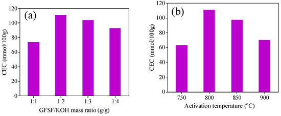 Cation exchange capacity (CEC) is an important index for rating adsorption materials, which reflects the cation exchange capacity of porous materials. The higher CEC of the adsorbent material means that there are a large number of adsorption sites inside the material, and its saturated adsorption capacity is also larger. The CEC of GFSF was 27.17 mmol/100 g. The influence of different operating conditions on the CEC value of GFSA is shown in Figure 2. In the experiment (Figure 2a), the activation temperature (800 °C) and the activation time (90 min) remained unchanged, GFSF/KOH mass ratios ranged from 1 to 4 g/g. The CEC of GFSA obtained by activation with different mass ratios firstly increased and then decreased. When the GFSF/KOH mass ratio was 2 g/g, the CEC of GFSA reached the maximum. The concise diagram of the reaction mechanism of KOH and C is shown in Figure 1. KOH reacted with C in GFSF (Equations (3)–(5)) to generate K2CO3, K2O, H2, and CO in the activation process [35].