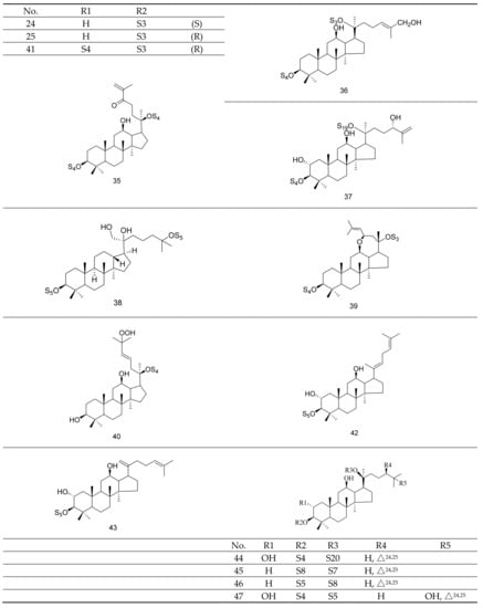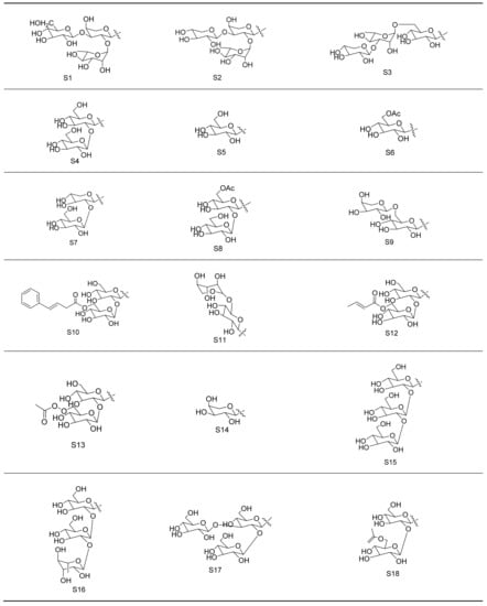 Gypenosides isolated from GP were believed to be the major active constituents responsible for its various biological activities and reported clinical effects. In 1976, the dammarane-type saponins from GP were isolated by Japanese scholars for the first time [5]. By 2017, nearly 201 dammarane-type gypenosides had been reported in GP [6]. Since 2017, 47 new dammarane-type gypenosides had been isolated and identified, the structures are shown in Figure 2, eight of which were consistent with ginsenosides Rb1, Rb3, F2, Rg3, Rc, Rd, malonyl-Rb1, and malonyl-Rd, respectively. These ginsenosides made up around 25% of the total gypenosides in the plant, and GP was the first plant containing ginseng saponins outside of the Araliaceae family. Therefore, GP has been praised as “southern ginseng” [2]. In addition, two cucurbitane-type saponins were found in GP [7,8], and their structures are shown in Figure 3.