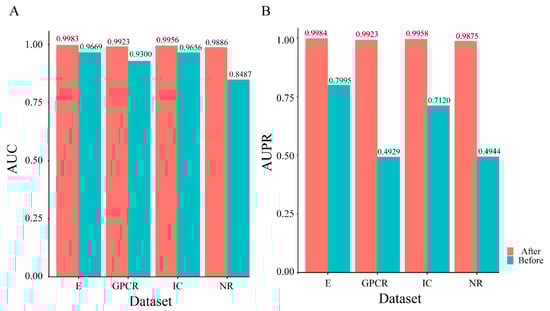 Due to the number of positive examples is much smaller than the number of negative examples, the indicators SE and SP are proportional to the correct proportion of positive and negative examples in the sample, and the indicator ACC has no significance in measuring the merits of the algorithm []. Therefore, the indicators that can reasonably measure the evaluation performance of the prediction model are AUC and AUPR among the above-mentioned indicators. To reflect the effect of data balance on the prediction performance of the model more directly, the visual display of the AUC and AUPR comparison under NR, GPCR, IC, and E datasets on unbalanced datasets and balanced datasets is shown in Figure 2. The evaluation indicators mentioned above are shown in Supplementary Table S5.