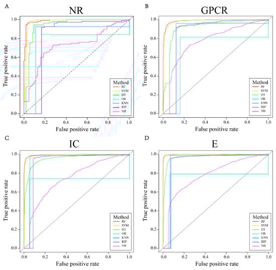 The representative ROC curves of different classifiers in 5-fold cross-validation of four datasets, i.e., NR (A), GPCR (B), IC (C), E (D).
