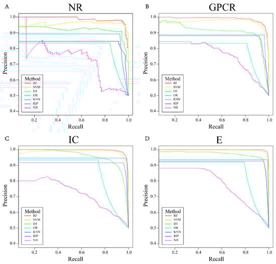 Figure 3 shows one of the ROC curves of seven different classification algorithms under the NR, GPCR, IC, and E datasets in five-fold cross-validation, while other ROC curves are shown in Supplementary Figure S3. Figure 4 reveals one of the PR curves of seven different classifiers under four datasets in five-fold cross-validation, while other PR curves can be found in Supplementary Figure S4.