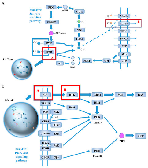 For the 52 breast cancer target proteins and the PsePDC-DTIs model trained in gold standard datasets, we predict all the DTIs mentioned in Section 4.1.2 and rank them by their probability. There are 383 predicted DTIs with a probability greater than 0.5 reported in Supplementary Table S7, which means 0.47% pairs were predicted as interaction. This is in line with the fact that the number of non-interacting pairs is far more than the number of interaction pairs []. We extract the top 10 drug–target pairs ranked by their prediction probability values, as listed in Table 3, and present the potential mechanism of predicted DTIs in Figure 5. Figure 5A shows that IP3R, the target of caffeine (DB00201), regulates KCNN4 via Ca2+ in the salivary secretion pathway. Figure 5B demonstrates that GF, the target of afatinib (DB08916), regulates RTK directly.