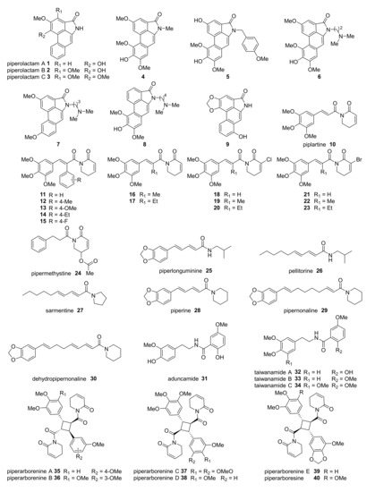 Aduncamide 31 was first isolated from the leaves of P. aduncum as part of a Swiss research program interested in the isolation of biologically active metabolites found in the traditional medicine of Papua New Guinea [104,105]. Even though 31 presented cytotoxicity against KB cells (HeLa-derived tumorigenic cells, ED50 = 18.0 µM), no further research was conducted with this compound. Although three natural analogues of 31 were found in P. taiwanense (32–34), no cytotoxicity has been observed for this set of compounds so far [106].
