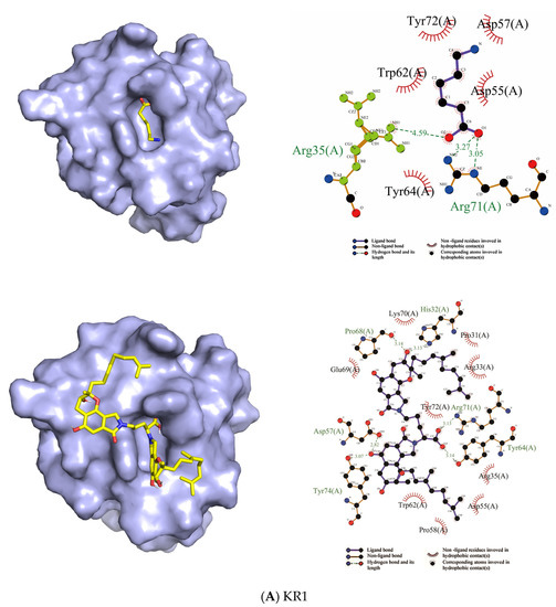 EACA formed two hydrogen bonds (3.07 Å and 3.28 Å) with Lys57 and Arg71 of KR3, respectively, in addition to strong hydrophobic interactions with Arg36, His33, His64, Trp72, and Trp62. FGFC1 formed three hydrogen bonds (3.11, 3.22, and 2.97 Å) with residues Ser79, Ile77, and Gly4 of KR3, in addition to hydrophobic interactions with Asp81, Leu2, Val17, Lys76, Tyr74, Cys75, Glu73, Trp72, Ala60, Arg59, and Thr5 (Figure 7C).