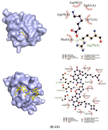 Two hydrogen bonds were formed between EACA and Arg70 of KR2 (3.20 and 3.04 Å) in addition to hydrophobic interactions with Trp71, Trp61, Asp56, Asp54, and Phe63. FGFC1 formed hydrogen bonds with residues Gly34, Asn55, and Lys39 of KR2, with bond lengths of 2.94, 3.16, and 2.86 Å, respectively, along with strong hydrophobic interactions involving Trp71, Asp54, Tyr35, Lys43, Pro53, Asn52, Glu7, Asn42, Phe40, Asp56, and Trp61 (Figure 7B).