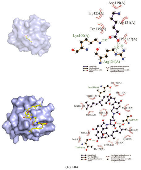 EACA formed three hydrogen bonds with Lys100 (2.97 Å) and Arg134 (2.82 and 3.30 Å) of KR4 in addition to hydrophobic interactions with Trp135, Trp125, Asp119, Asp121, and Phe127. Three hydrogen bonds were formed between FGFC1 and Thr94, Ser89, and Leu110 of KR4, with bond lengths of 3.00, 3.19, and 2.99 Å, respectively, in addition to strong hydrophobic interactions with Ser92, Pro95, Thr129, Cys87, Gln88, Lys86, Asn113, Met112, Thr111, Pro102, Thr101, Glu103, Met93, and Ser91 (Figure 7D).