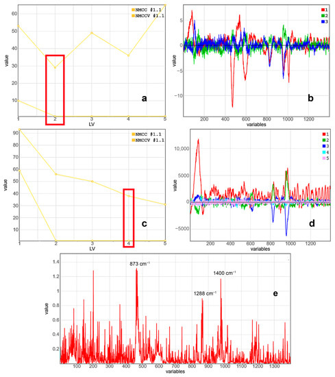 The first PLS-DA model included following preprocessing: spectrum smoothing (Savitzky–Golay filtering with zero derivative and zero polynomial, only averaging the signal in the window over fifteen points), background subtraction (baseline ALS), and normalization (SNV). For the constructed PLS-DA model, an analysis of its behavior was carried out on the calibration and validation datasets (Figure 4). Figure 4a shows that it is necessary to select two latent variables, since a break in the curve occurs, the discrimination accuracy on the validation dataset drops (the number of misclassified samples—NMCCV increases). Latent variables (loading vectors) show the greatest scatter of spectral data between classes when orthogonal decomposition. The maximum modulus values are in good agreement with the spectral features of the preprocessed spectra. In this case, it is worth noting high-frequency noises of low intensity, despite the smoothing of the spectra. However, excessive smoothing of the spectra can lead to the loss of spectral information.